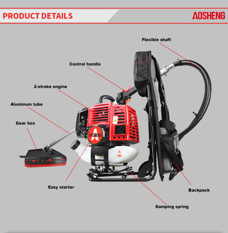 高性能4ストロークエンジン、 排気量は38CCです。開けた荒れ地でのプロフェッショナルな使用 チューブサイズ26mm*1.5mm、強度の高いフレキシブルシャフト。 切断幅は420mm、寿命は150時間以上 新しいデザインのガイドカバー。