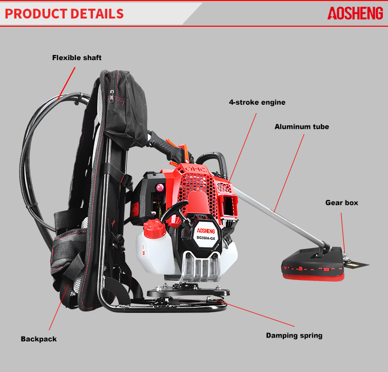 高性能4ストロークエンジン、 排気量は38CCです。開けた荒れ地でのプロフェッショナルな使用 チューブサイズ26mm*1.5mm、強度の高いフレキシブルシャフト。 切断幅は420mm、寿命は150時間以上 新しいデザインのガイドカバー。
