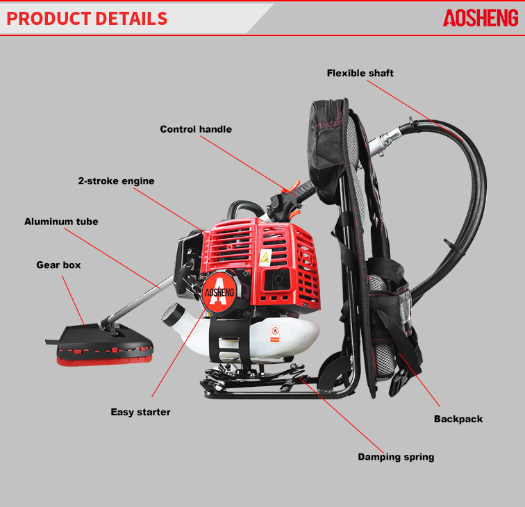 高性能4ストロークエンジン、 排気量は38CCです。開けた荒れ地でのプロフェッショナルな使用 チューブサイズ26mm*1.5mm、強度の高いフレキシブルシャフト。 切断幅は420mm、寿命は150時間以上 新しいデザインのガイドカバー。
