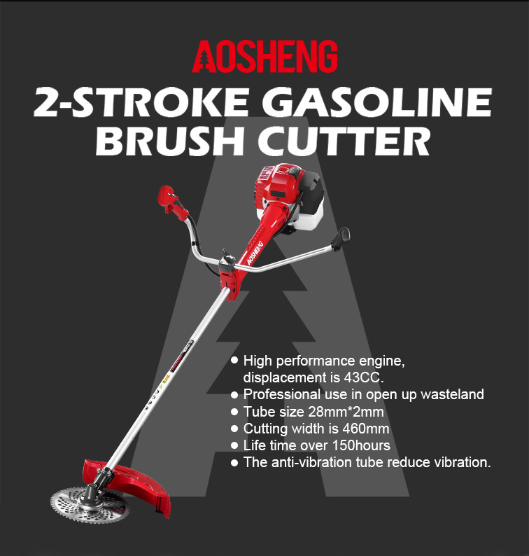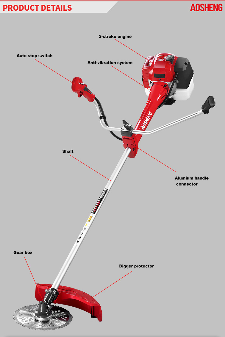 高性能4ストロークエンジン、 排気量は38CCです。開けた荒れ地でのプロフェッショナルな使用 チューブサイズ26mm*1.5mm、強度の高いフレキシブルシャフト。 切断幅は420mm、寿命は150時間以上 新しいデザインのガイドカバー。